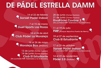 Llega a las pistas de pádel de la Comunidad de Madrid una nueva edición del Circuito de Pádel Estrella Damm. Todos los seguidores de este Circuito ya pueden consultar el nuevo calendario en la página web oficial www.padelestrelladamm.es que arrancará con la prueba del 14 al 22 de febrero en Sanset Padel Indoor.
