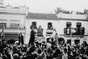 En 1978, la Imagen de la Divina Pastora fue intervenida en los Reales Alcázares de Sevilla por Peláez del Espino, el pueblo vivió intensamente este proceso y la Divina Pastora fue recibida de forma apoteósica en la Plaza del Llano en el mes de febrero. El emotivo instante lo capta la fotografía que traemos a la sección de Memoria gráfica La Virgen fue colocada en un estrado sobre su peana de plata que puede observarse antes de la remodelación con un centro de flores en su interior. Antonio Solís y el Padre Rejos la descubren ante la abarrotada plaza que la aclama con infinidad de piropos y vivas. Junto a la Imagen de la Pastora, también está el entonces párroco de Cantillana, Don Enrique Carrasco Zamudio, se puede ver que en todos los balcones y azoteas no cabe un alfiler, todo el pueblo se congregó para recibir a la Virgen.