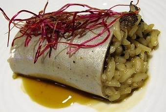 No hace falta que lo reconozca guía alguna (aunque, por supuesto, esa visibilidad ayuda a vivir mejor): Lluerna y su chef, Víctor Quintillà, son de lo mejor que hay, ahora mismo, en Catalunya. Su trabajo serio y reflexivo sobre cada ingrediente que trabaja, sus puntos de cocción medidos (hasta cinco verduras en su punto y medida exactos en un superior, complejo y prestigioso "Verdures d'hivern amb tòfona"), su sensibilidad y habilidad en todos los palos de la cocina (desde el aperitivo -la tostada de aceite con trufa fue de lo más sencillo pero sabroso que probamos-, hasta los postres), su búsqueda incesante de la colaboración con el proveedor, su interés por los vinos y, por qué no decirlo, su humildad, le colocan en un sitio de privilegio para seguir mejorando y alegrándonos la vida. Algunos platos estuvieron a la altura de lo mejor que he comido yo en los últimos tiempos. Conozco ya un poco al chef y sé de su debilidad por la cocina cotidiana en texturas distintas pero sabores profundos y de toda la vida. Su risotto de trufa negra es para tomar nota. No convenció a todos (en una Asamblea como ésa hay que ir con mucho cuidado porque la experiencia gastronómica que se acumula en la mesa es realmente apabullante), cierto, pero yo creo que el carnaroli del Delta fue elegido con conciencia. En esa receta (foto superior), el arroz no tiene que llamar toda la atención porque el poder está en el bocado del conjunto. Esa gelatina delicada, hecha con caldo de gallina y trufa de suave sabor, envuelve al arroz y permite que cierres los ojos y el resultado, en la boca, sea casi el de un arroz caldoso, pero con el caldo en gelatina y el arroz en risotto. A mí me encantó tanto como me preocupó...con las verduras de invierno y ese trampantojo de arroz caldoso, el nivel empezaba muy alto. Seguir así no sería sencillo...