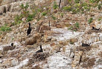 La foto anterior está tomada el viernes pasado en una visita a la colonia de cormoranes moñudos de Castríos, en Tapia (Asturias) y en ella se puede observar que todos los adultos se encuentran echados en los nidos, o sea que aún están incubando o tienen pollos pequeños. El año pasado en las mismas fechas prácticamente todas las parejas se encontraban con pollos volantones y solo unas pocas parejas, seguramente formadas por ejemplares jóvenes, tenían pollos pequeños.