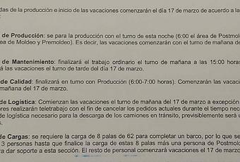 La parada de producción se producirá mañana martes 17 de marzo quedando el personal de vacaciones hasta el 23 de marzo. En el caso de aceptarse el ERTE durante este periodo vacacional, se aplicaría de manera inmediata.