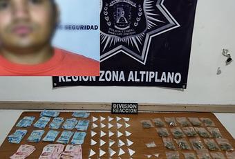 Matehuala.- Elementos de la Secretaría de Seguridad Pública del Estado, lograron la detención de una persona que transportaba cerca de 50 dosis de distintas drogas, así como dinero en efectivo que se presume fue obtenido por la venta de estas substancias.