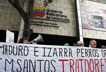 Pancarta durante manifestación en rechazo a la deportación de Joaquín Pérez Becerra. Frente a Cancillería, 28 de abril de 2011. Alude al Ministro de Relaciones Exteriores, Nicolás Maduro, y al Ministro de Comunicación e Información, Andrés Izarra. Sin duda alguna, una torpeza política. Por: Luigino Bracci.