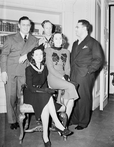 Leslie Howard, Vivien Leigh y Olivia de Havilland flanqueados por David Selznick (izquierda) y George Cukor (derecha), el día que firmaron sus contratos.