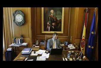 Felipe VI, el actual Rey de España, en su despacho. Detrás suyo puede verse un retrato de Carlos III, el monarca al que considera un modelo en el que fijarse.