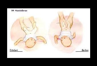 El neonatólogo es quien se da cuenta de esta anomalía al explorar al recién nacido al momento del nacimiento, cuando le practica las maniobras de Ortolani y Barlow. Estas maniobras consisten en una serie de movimientos que, realizan con el niño estando boca arriba y lo más relajado posible, se flexionan y abren con delicadeza las piernas del recién nacido para comprobar si la articulación es correcta. Se hace primero en una cadera y luego en la otra. La maniobra de Ortolani permite comprobar si hay luxación realizando rotaciones de la articulación, mientras que la maniobra de Barlow permite comprobar si hay posibilidad de que se pueda producir una luxación. La mitad de los casos de displasia de cadera se detectan en el período neonatal gracias a estas maniobras.