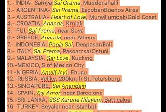 Lista real de los 18 ashrams en todo el mundo. ¿Por qué 18? Swami dijo porque 18 es un número santo. 1 + 8 = 9