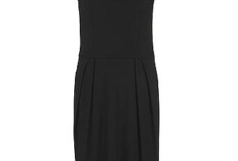 Vestido negro en forma casual con zapatos chatos y accesorios en marron