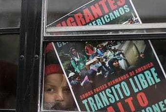 Un niño centroamericano que viaja con una caravana de migrantes, pares desde un autobús que lleva al grupo hasta el muro fronterizo para una reunión de migrantes que viven en ambos lados de la frontera, en Tijuana, México, el domingo 29 de abril de 2018. El el letrero dice en español: Todos somos países hermanos de las Américas. Tránsito libre Detener las deportaciones. “(Hans-Máximo Musielik / Associated Press)