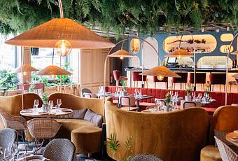 Te enamorarán sus lámparas de rafia, sus techos homenaje a la naturaleza; cubiertos con vegetación colgante y grandes hojas reproducidas en madera y mimbre. Tonos naturales que, siguiendo el estilo de otros restaurantes del grupo como Perrachica y Habanera, hacen el espacio más acogedor contrastando con pinceladas en tonos intensos como el azul (protagonista del espacio) y el teja, de las butacas que hay en el espacio. Te enamorará también el protagonismo que le dan al espacio los sillones curvos unidos en color mostaza apagado.