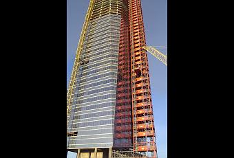 Mi cometido fue el de ejercer como jefe de obra en la empresa PERI para la ejecución de una partida singular y muy especifica. Una torre auxiliar de 220 m de altura y 50 m2 de planta por la que debían discurrir cuatro elevadores y un montacargas. Su misión era la de facilitar la logística vertical de materiales y personas durante el periodo que duró la construcción. Como os podéis imaginar, la ejecución de este tipo de elementos es fundamental para poder realizar un edificio de estas características, ya que el uso de las grúas torre se centra en dar servicio a la construcción de la estructura principal del edificio dada su complejidad.