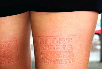 Porque a mí me cuesta encontrar la diferencia entre marcar a un toro con un hierro ardiendo y esto. Aprovechando que en Nueva Zelanda se han puesto de moda los shorts, Superette, una marca de moda, ha utilizado los bancos de la calle para "imprimir" efímeramente un mensaje publicitario en las piernas de las chicas. Dudo de su eficacia, pero no deja de ser un soporte -los muslacos de las señoritas- bastante inusual, ¿no creéis?