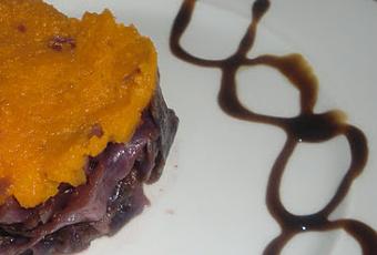 Y si tenemos invitados podemos emplatar con un aro la lombarda, y cubrir por encima con una capa fina de calabaza asada. Queda supervistoso por el contraste de colores, y luego cada uno lo mezcla en su plato.