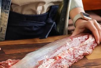 - Ahora que tenemos nuestro lomo limpio, vamos a cortar trozos de unos 130gr, de manera perpendicular a la carne.