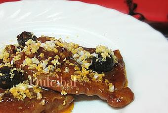 Uno de sus ingredientes fundamentales, aparte del lomo, claro está, son las olivas negras, de Aragón (por supuesto), y el jamón serrano. Yo he utilizado un jamón ibérico de la empresa JAMÓN Y PICO, que distribuye jamón y embutidos ibéricos por toda Europa sin gastos de envío. Podéis ver el aspecto y color tan delicioso que tiene: