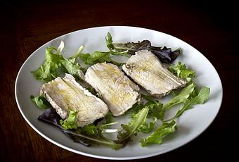 Sacamos, retiramos la sal, dejamos enfriar un poco y secamos con una servilleta de papel. Posteriormente cortamos el lomo con un cuchillo, a rebanadas finas.