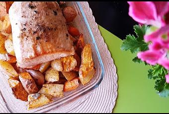 2.-En una sartén añadimos un poco de aceite de oliva y doramos el lomo de cerdo unos minutos por ambos lados. Salpimentamos al gusto, le añadimos un poco de tomillo fresco por encima. Colocamos el lomo de cerdo sobre los tubérculos que tenemos en el horno. Cocinamos el lomo 40 minutos con el horno a 180º. Retiramos del horno y servimos la carne con los tubérculos.