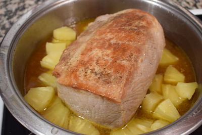 Damos la vuelta a la carne y añadimos 4 rodajas de piña troceadas junto con el almíbar de la piña y de las cerezas. Sigue cociendo a fuego bajo durante otra media hora. Comprueba que la carne está tierna.