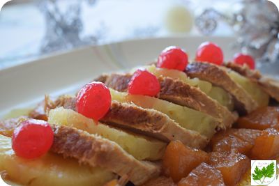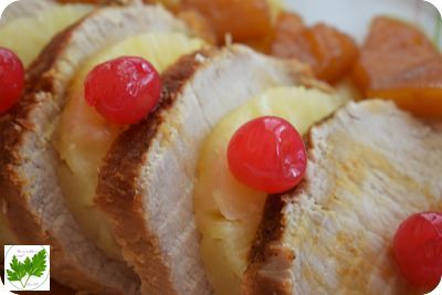 Sirve la carne cortada en rodajas, adornada con la piña restante de la lata y las cerezas. Agrega por encima de la carne un poco de la salsa, la que queda disponla en una salsera aparte. Pon también sus trozos de piña alrededor y adorna con las cerezas.