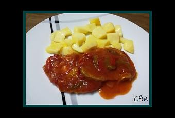 -8 filetes de lomo-2 cebolletas-1 pimiento rojo-2 pimientos verdes-6 dientes de ajo-1 kg de tomate pera-Aceite de oliva -Sal-Azúcar