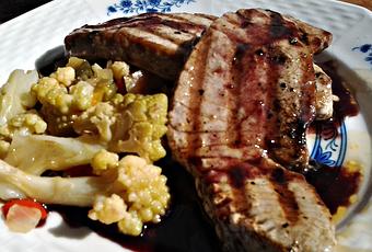 - En la parrilla quedan los jugos del pescado por lo que al finalizar de hacerlos añadimos un chorro de vinagre de Modena y dejamos que se mezclen los?jugo que echamos por encima de los filetes de atún