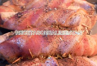 Cogemos los filetes de cerdo y rodeamos cada uno con una tira de tocino haciendo un canutillo. Para que quede bien sujeto, podemos ayudarnos de un palillo.