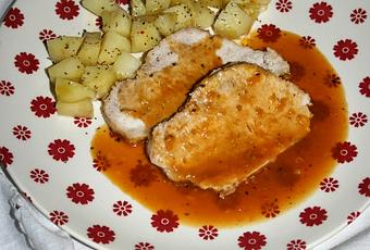 Ponemos el lomo en una fuente y echamos la salsa por encima.