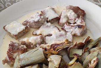 Hacer los tacos de solomillo de cerdo a la plancha y montar el plato, sirviendo 5 ó 6 trozos por persona, cubriendo ligeramente con la salsa de queso y poniendo la guarnición de las alcachofas, pasar por la plancha para que queden bien crujientes.