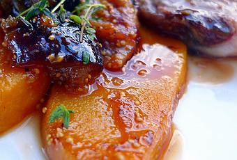 2 Melocotones8 higosAceite de oliva virgenAzúcarSalPimientaTomilloElaboración del Lomo de cerdo con melocotones e higos:Salpimentamos los filetes de lomo de cerdo. Reservamos en la nevera.Pelamos y cortamos en rodajas de tres o cuatro milímetros los melocotones. Lavamos y cortamos en cuartos los higos.En una sartén con una cucharada de aceite de oliva, pochamos un par de minutos la fruta.Añadimos una cucharada de azúcar por encima y salteamos.Apagamos el fuego y reservamos en la sartén.Mientras se templa la fruta, elaboramos los filetes de lomo de cerdo a la plancha.Repartimos en platos la carne y la acompañamos con un poco de la fruta.Esparcimos un poco de tomillo (a ser posible fresco) por encima de la fruta.Servimos nuestro flamante lomo de cerdo con melocotones e higos y seguro que gustara a todos los comensales.