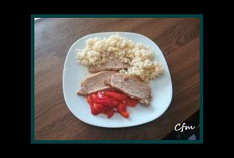 1 solomillo de cerdoc/n de pimienta negra recién molidac/n de salc/n de aceite de oliva virgen extra70 gramos de jugo de cocción de los pimientos escalivados2 pimientos escalivados o asados2 ramitas de albahacaunas escamas de sal Maldon200 gramos de cuscús precocido200 gramos de caldo de verduras o de ave1 limón1 ramita de albahaca frescaLimpia el solomillo del exceso de grasa que pueda tener, salpiméntalo al gusto y ponlo en una plancha o sartén caliente, con un poco de aceite de oliva virgen extra, para dorarlo a fuego medio-alto en todo su contorno. Una vez que esté dorado, añade el jugo de los pimientos escalivados, baja el fuego y continúa la cocción, mojando de vez en cuando la carne con el jugo, hasta que reduzca y quede glaseado.