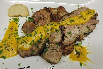 1 lomo de cerdo de 1,5 Kg.1 cebolla.2 manzanas reineta.1 zanahoria.100 grs. Brandy.200 grs. Agua.Sal. Orégano.Perejil.50 grs. Aceite de oliva.Semillas de amapola para decorar.