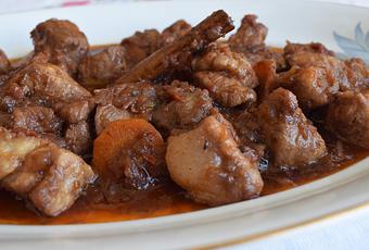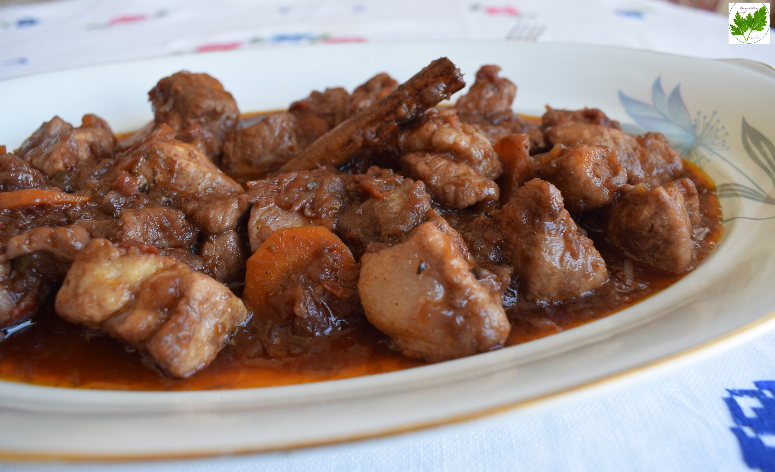 Pon a calentar aceite en el fondo de una cazuela. Salpimenta, enharina la carne y dórala. Retira a un plato y reserva.Pica la cebolla y ajos, sofríe en el mismo aceite. Cuando adquieran color, añade la zanahoria cortada en rodajas y continúa sofriendo unos minutos más. Añade el tomate, remueve y deja cocer durante unos 10 minutos a fuego lento. Echa el pimentón, rehoga un minuto y añade el vino, espera a que evapore el alcohol. Incorpora el caldo, canela, granos de pimienta, miel y orégano. Cuando comience a hervir agrega la carne reservada, baja a fuego medio-bajo y sigue cociendo hasta que la carne se ponga tierna y la salsa quede concentrada.