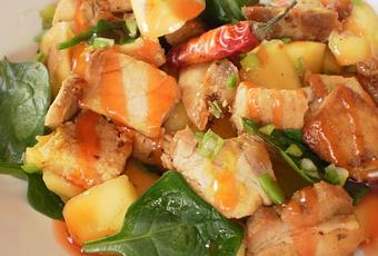 Carne de cerdo asada cortada en trozos ( LOMO DE CERDO AL HORNO, enlace de la receta), mango natural cortado en trozos, hojas frescas de espinacas, una guindilla roja, dos o tres cucharadas soperas de salsa de soja.