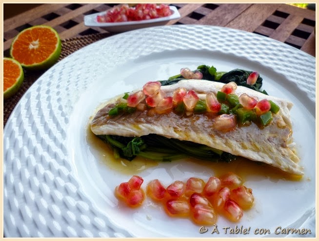 Ya sé que hace "dos días" que acabo de volver de Lisboa, pero ha coincidido así y no seré yo quien ponga pegas a este tipo de "esfuerzo". Así que comprenderéis que cuando digo que voy liada, es que voy liada de verdad, pero hasta arriba. Y si octubre ha venido fuerte en lo viajero, también lo ha venido en lo laboral, y otro día que me voy hacía casa pensando en algo rápido que preparar. ¡Todavía no he probado las mandarinas y la granada que me regalaron! Al pasar por una verdulería, sí, esta vez le voy a ser infiel a mi querido Mercado Central, compro un manojo de Espinacas frescas y tiernas, su buen aspecto me ha llamado la atención. A continuación me paso por la pescadería y me llevo un par de lubinas ya preparadas en lomos y sin espinas.