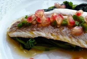 - Transcurridos los 15 minutos, montar los platos. En la base poner un lecho de espinacas y salar. Añadir un lomo de lubina sin piel y regar con un chorrito de Vinagreta de Mandarina. Agregar unos cuantos granitos de granada.