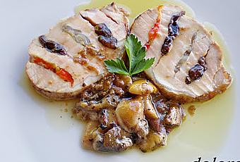 Cogemos el lomo, lo secamos y ponemos un ingrediente en cada abertura: pimiento rojo, ciruelas, cebolla, ciruelas, pimiento verde. Salpimentamos. Apretamos bien para que no se salga el relleno y lo atamos bien. (Ver en nota).