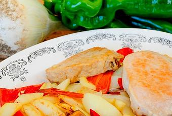 Para acompañar, la tradición manda unas patatas a lo pobre con pimientos y cebolla fritos, y un huevo frito con puntilla, aunque se me olvidó ponerlo en la foto, (en cuanto repita plato le hago foto, jeje)