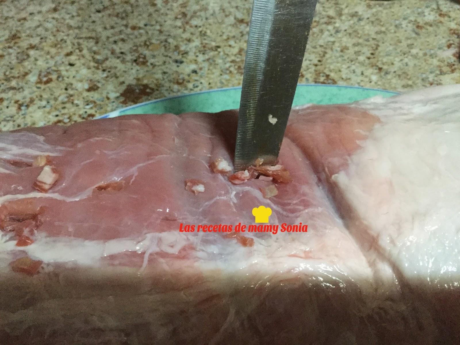 En primer lugar con la ayuda de un cuchillo con punta introducimos los trocitos de