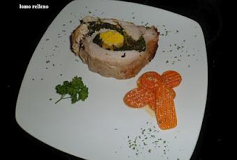 ingredientes:lomo1/2 litro de vino blanco100gr d almendras3 dientes de ajos2 cebollas1 tomate2 zanahorias1 laurel2 clavoshuevos1 pastilla de caldo250 gr de espinacasqueso en lonchaspasasorejonessalaceiteAbrir la cinta de lomo, rellenarla con las espinacas, las pasas los orejones el queso en loncha y los huevos.Para que no se muevan los huevos y queden centrados yo los he pinchado en un palo de pinchitos. Enrollar y atarEn una Sartén Dorar la Carne y luego ponerla en una Olla,continuación,echarel vino blanco,el laurel,2 clavos,100 grs Almendras molidas ,una Zanahoria a rodajas,y 1 pastilla de caldo.En la misma sartén , reogar las cebollas picadas,los ajos, el tomate,y una zanahoria.Cuando todo este tierno,pasarlo por el pasa puré,y hecharlo a la carne,y cubrir con agua,y cocer durante una hora,pinchar la carne con una aguja de de hacer puntos de vez en cuando.Dejar enfriar y cortar a Rodajas. acompañar con la salsa.Los fogones de la Mari