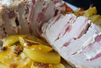 Esta receta, es un lomo relleno al horno, sencillo y muy rico. La presentación es estupenda y queda muy jugosa, con el relleno que le puse de beicon y queso.
