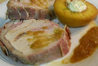 Los melocotones hacen una combinación y contraste perfecto para la carne de cerdo, y si ha todo esto se añade el relleno de queso de mascarpone, es una delicia de comer.