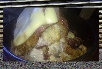 Cubrelo con papel de alumino para que no se queme por fuera, metelo en el horno durante una hora mas o menos, hay que vigilar que no se queme ni que se quede crudo,Hay que darle la vuelta para que dore por la parte de abajo y unos 10 min. antes de terminar la coccion, se ponen por encima unas tranchas de bacon y de queso. Y ya no se le pone el papel de aluminio.
