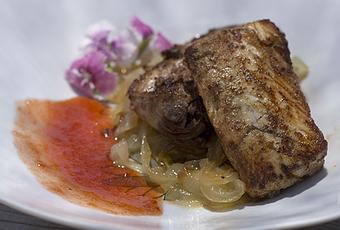 Para emplatar pones una cama de cebolla caramelizada, sobre ella pones uno o dos lomos del atún y en un lado la mermelada de tomate. También emplaté con unos pequeños claveles para darle un poco de color al plato.