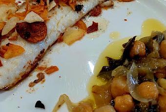 Emplatamos y los acompañamos de unos garbanzos y judías que habían sobrado del día anterior del puchero/cocido que habremos salteado con cebolla y ajos.