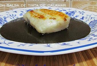 Lomos de merluza a la plancha con salsa de tinta de calamar