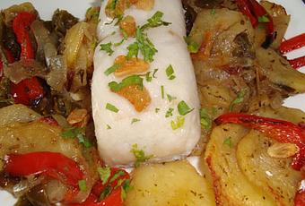 Cuando pase este tiempo pinchar con un palillo y comprobar que estas tiernas, sacar del horno y colocar encima los lomos de merluza que le hemos echado un poco de sal.