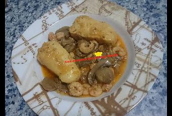 Añadimos las gambas y los champiñones y rehogamos. Incorporamos los lomos de pescado, el perejil, el avecrem, el vino blanco y una poco de agua.