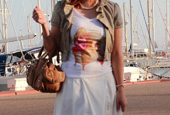Qué contenta me puse cuando recibí la camiseta solidaria de Estefanía, de su blog, conocido por la mayoría de vosotras, Con dos Tacones para colaborar en la investigación para la lucha contra el cáncer de mama, además es preciosa y tiene un colorido que me encanta. Para estrenarla y aprovechando la buena tarde que hacía, nos fuimos a pasear al puerto deportivo de Almerimar y de paso, estrenar la nueva Canon que os mostré en el anterior post. Para ello elegí un look muy ponible y muy de día, compuesto por la camiseta "condostaconera" una falda blanca, unos zuecos de madera y una cazadorita de cuero muy veraniega que me gusta mucho.