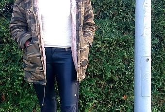 Buenos días!!!.Hoy os traigo uno look invernal total!! En la que combino el punto, el camuflaje y la piel. No os podéis imaginar lo abrigado que es el abrigo de camuflaje de Zara!!! El pantalón tiene mezcla de piel y tela elástica gruesa y los botines son tipo boxeador con ribete al estilo Gucci ( salvando las distancias jjjejje). El jersey de punto, es super calentito y lleva el punto horizontal que está muy de moda, con una gran trenza en el medio. Abrigo camuflaje: ZaraJersey punto: BlancoPantalón: ZaraBotas: MaripazGorro: Tienda local