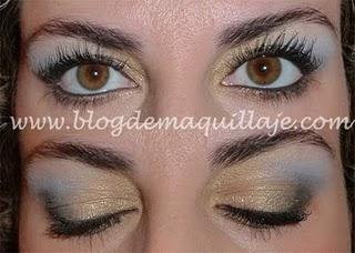 Pues aquí tenéis el resultado. Un bonito trío de azul celeste, oro y bronce. Una combinación que quizá a priori no elegiríamos, pero que vista en la modelo queda tan impactante que es imposible no querer probarla, verdad? Yo desde luego no me pude resistir.